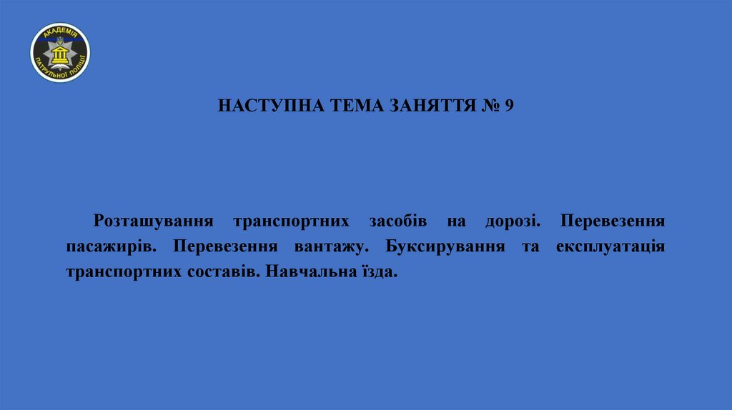 НАСТУПНА ТЕМА ЗАНЯТТЯ № 9Розташування транспортних засобів на дорозі. Перевезення