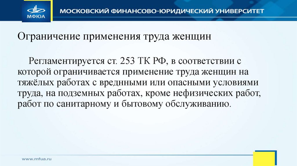 Ограничение применения труда женщинРегламентируется ст. 253 ТК РФ, в соответствии с