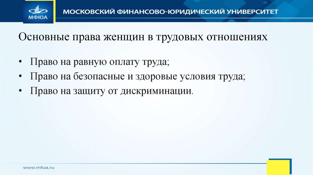 Основные права женщин в трудовых отношениях• Право на равную оплату труда;