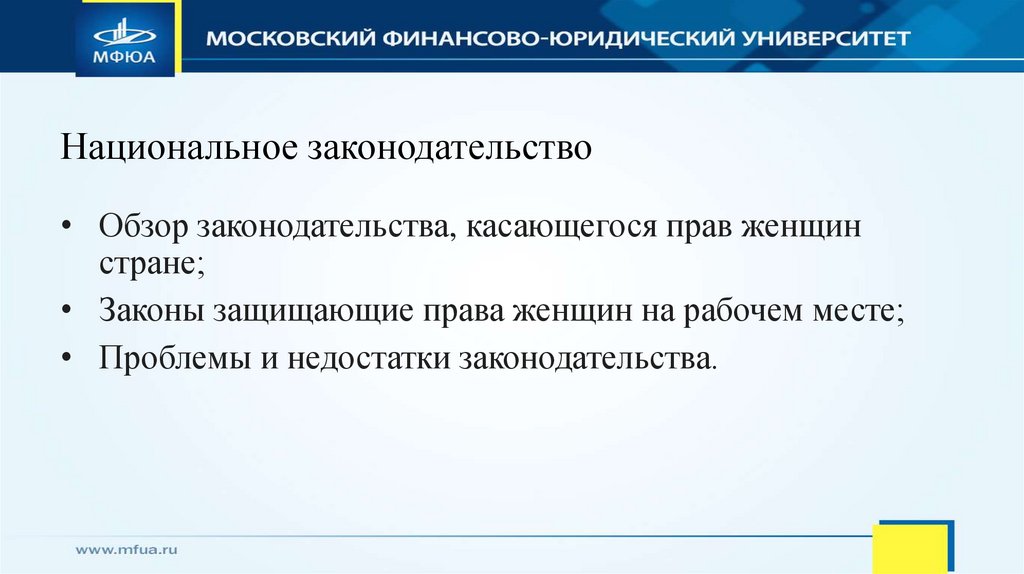 Национальное законодательство• Обзор законодательства, касающегося прав женщин