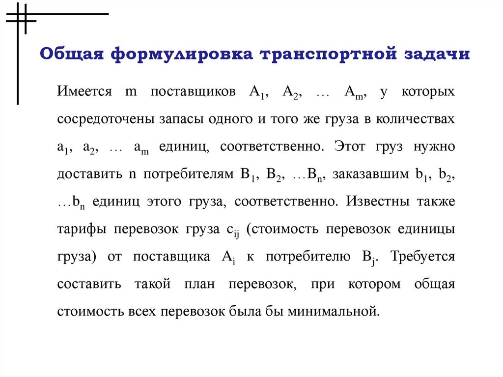 Общая формулировка транспортной задачиИмеется m поставщиков A1, A2, … Am, у которых