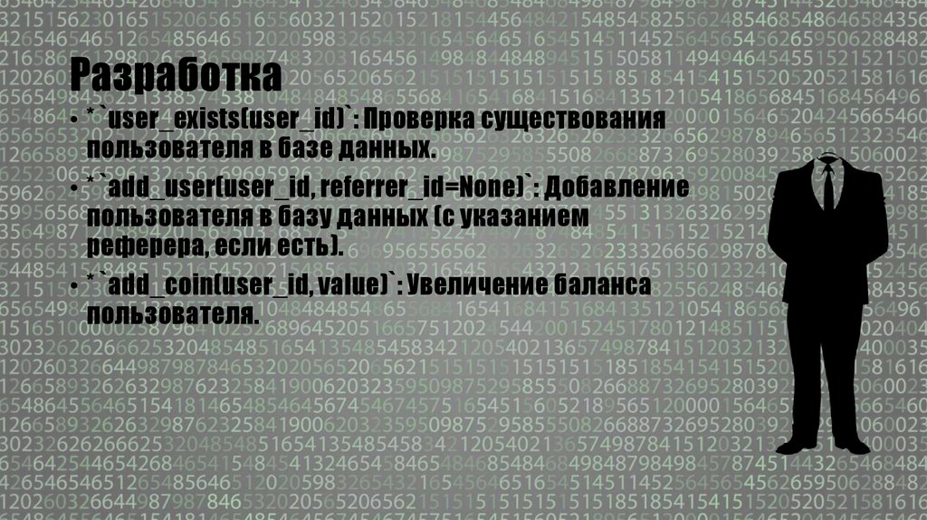 Разработка• * `user_exists(user_id)`: Проверка существования