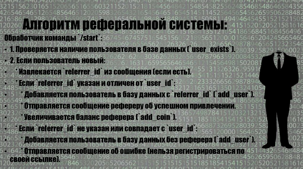 Алгоритм реферальной системы:Обработчик команды `/start`: