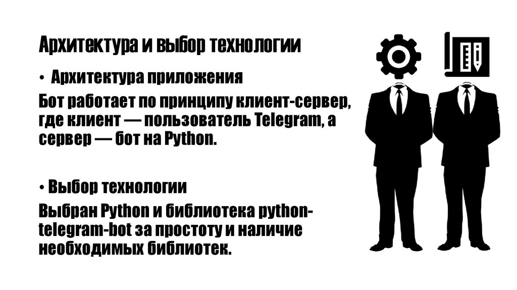 Выбран Python и библиотека pythontelegram-bot за простоту и наличие
