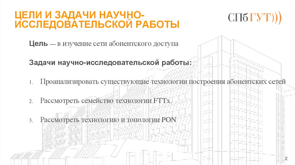 ЦЕЛИ И ЗАДАЧИ НАУЧНОИССЛЕДОВАТЕЛЬСКОЙ РАБОТЫЦель — в изучение сети абонентского доступа
