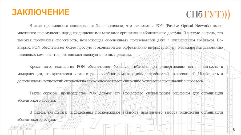 ЗАКЛЮЧЕНИЕВ ходе проведенного исследования было выявлено, что технология PON (Passive Optical Network) имеет