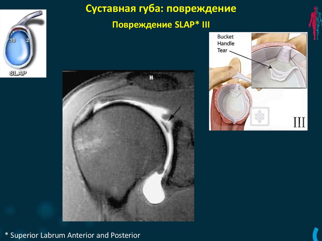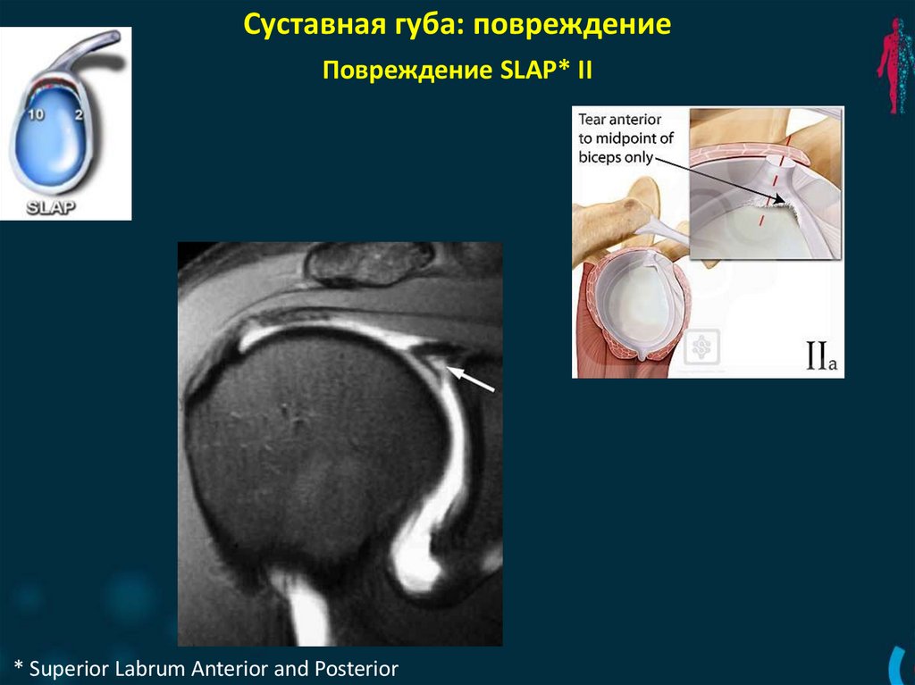 Повреждение типа SLAP IIB, но с большим распространением на заднюю часть губы.