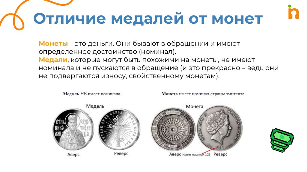 Отличие медалей от монетМонеты – это деньги. Они бывают в обращении и имеют