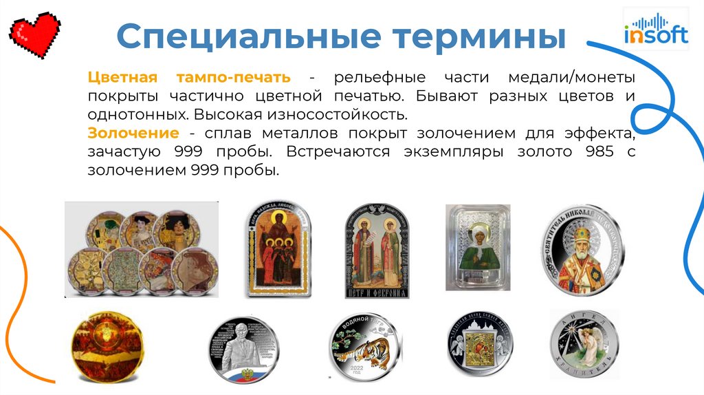 Специальные терминыЦветная тампо-печать - рельефные части медали/монеты