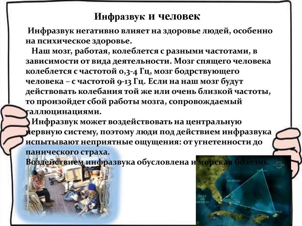 Инфразвук и человекИнфразвук негативно влияет на здоровье людей, особенно