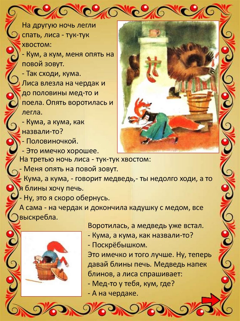 На другую ночь леглиспать, лиса - тук-тук