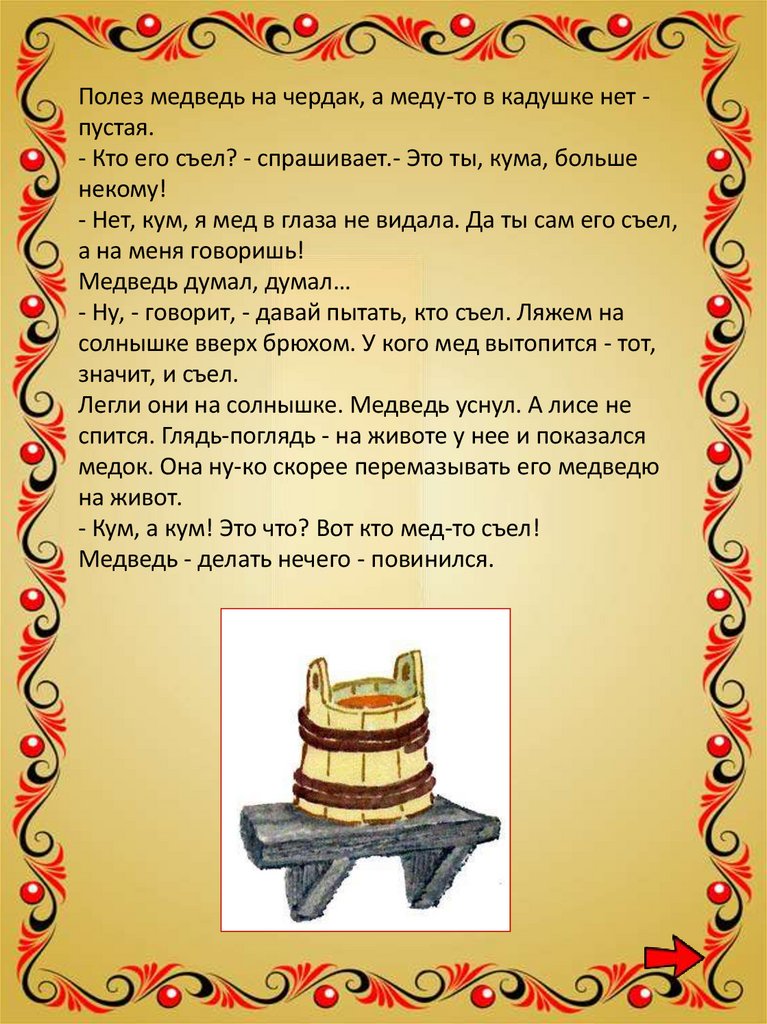 Полез медведь на чердак, а меду-то в кадушке нет пустая.- Кто его съел? - спрашивает.- Это ты, кума, больше