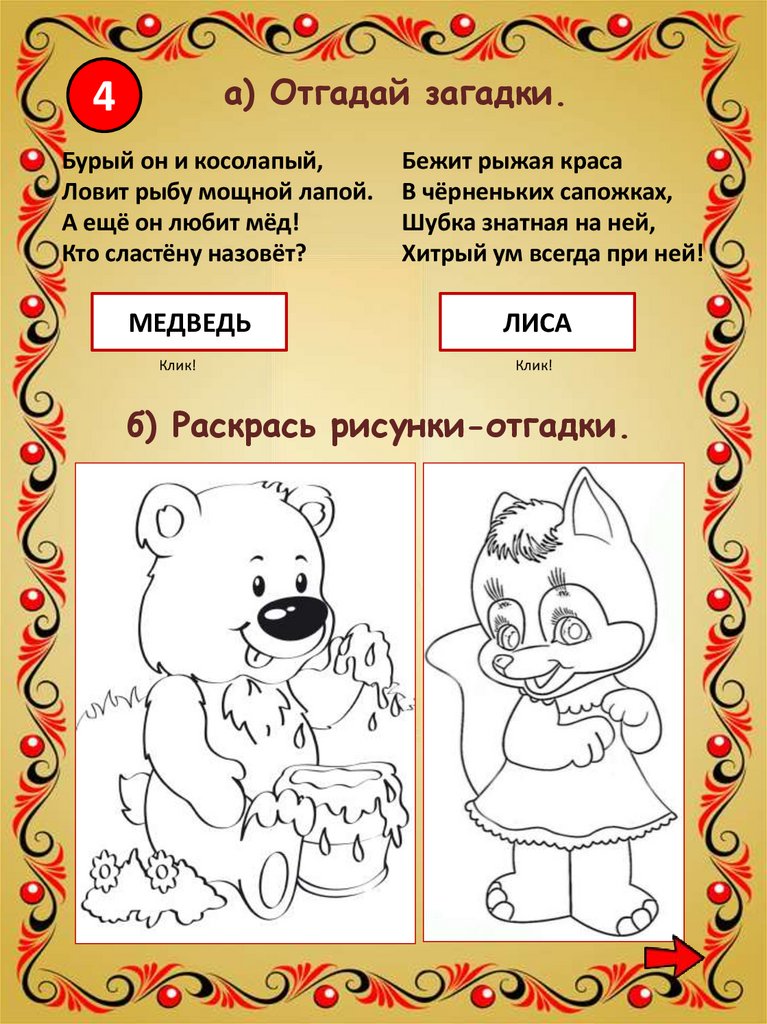 хитрую лису, неуклюжего медведя,