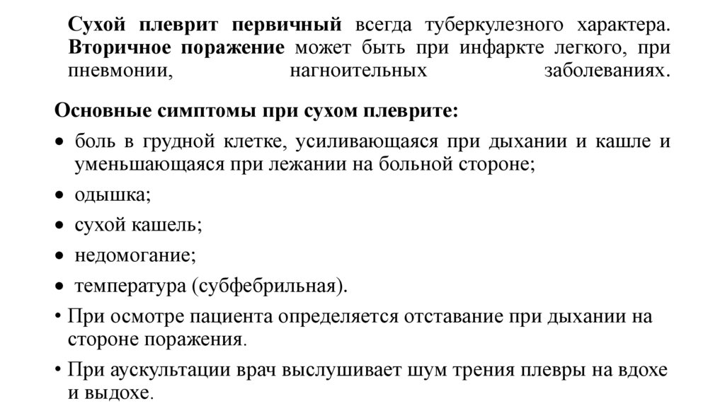Сухой плеврит первичный всегда туберкулезного характера.Вторичное поражение может быть при инфаркте легкого, при