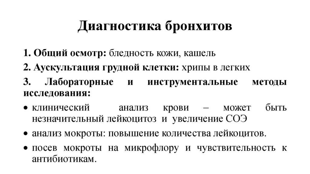 Диагностика бронхитов1. Общий осмотр: бледность кожи, кашель