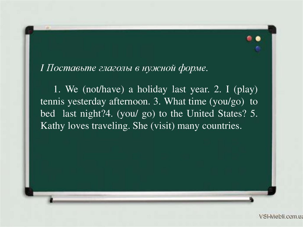 I Поставьте глаголы в нужной форме.1. We (not/have) a holiday last year. 2. I (play)