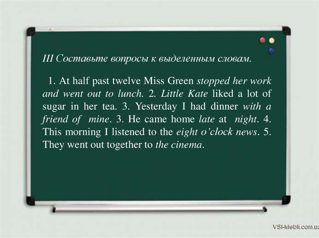 III Составьте вопросы к выделенным словам.1. At half past twelve Miss Green stopped her work