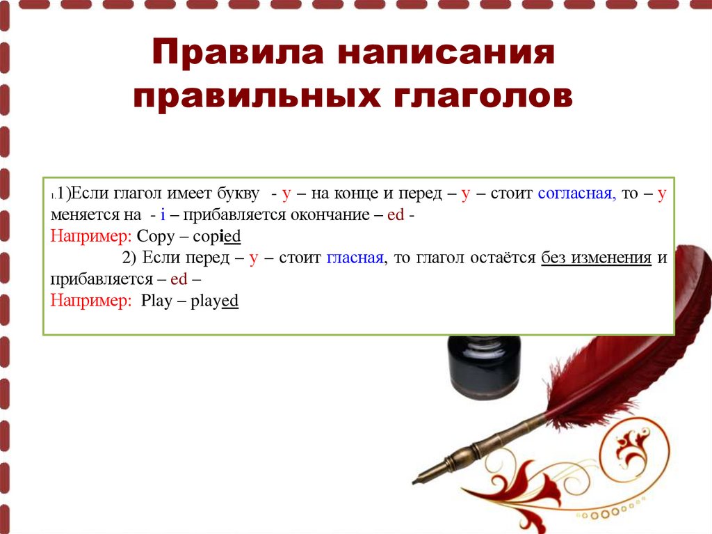 меняется на - i – прибавляется окончание – ed Например: Copy – copied