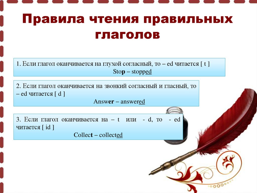 1. Если глагол оканчивается на глухой согласный, то – ed читается [ t ]
