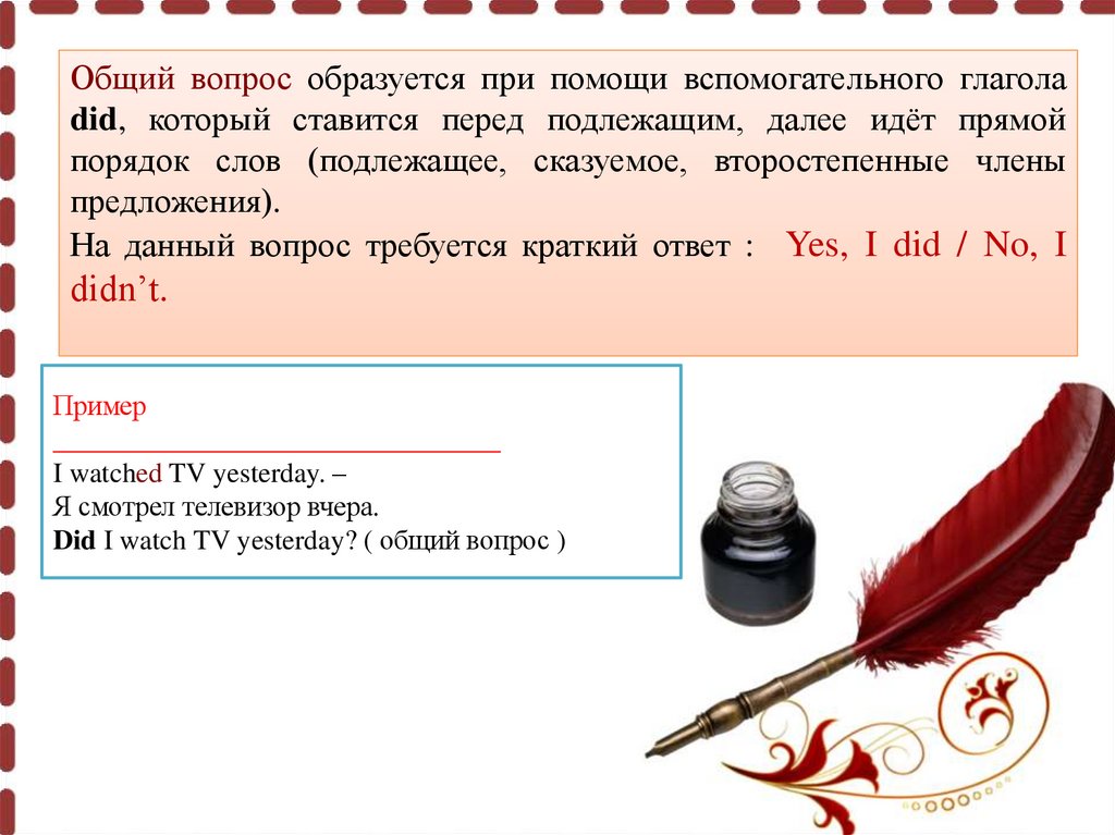 Общий вопрос образуется при помощи вспомогательного глаголаdid, который ставится перед подлежащим, далее идёт прямой