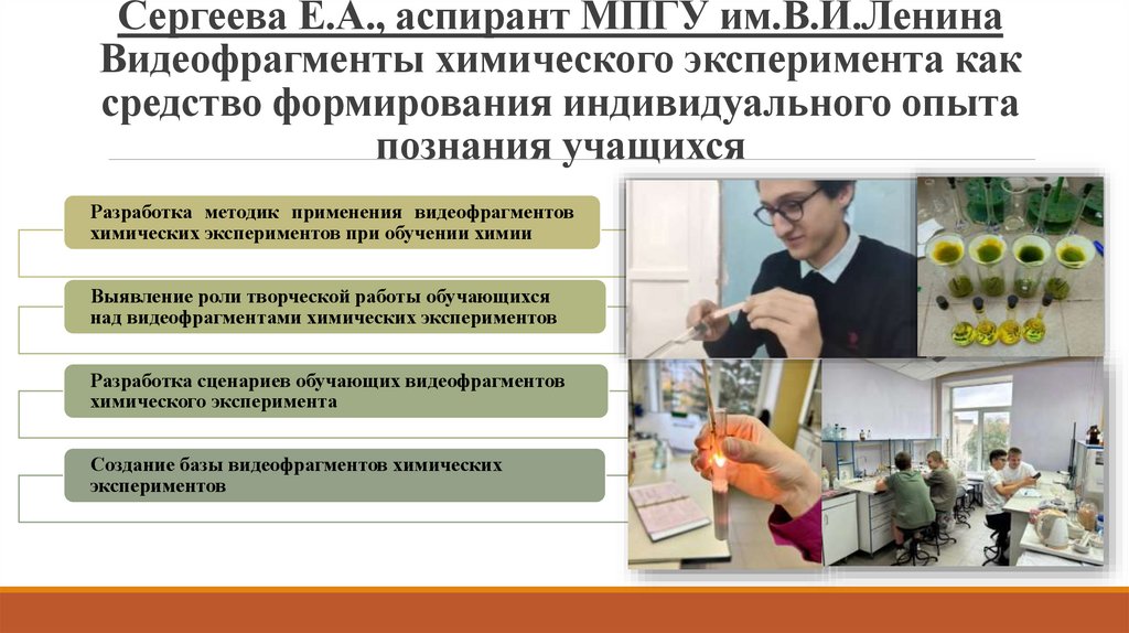 13. Сергеева Е.А., аспирант МПГУ им.В.И.Ленина Видеофрагменты химического эксперимента как средство формирования индивидуального