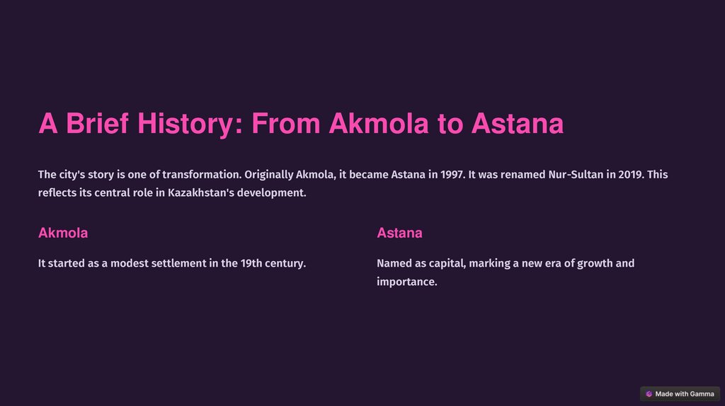 A Brief History: From Akmola to AstanaThe city's story is one of transformation. Originally Akmola, it became Astana in 1997. It was renamed Nur-Sultan in 2019. This