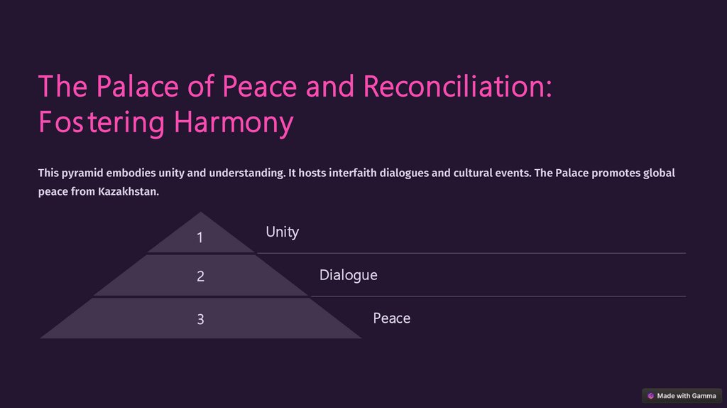 This pyramid embodies unity and understanding. It hosts interfaith dialogues and cultural events. The Palace promotes global