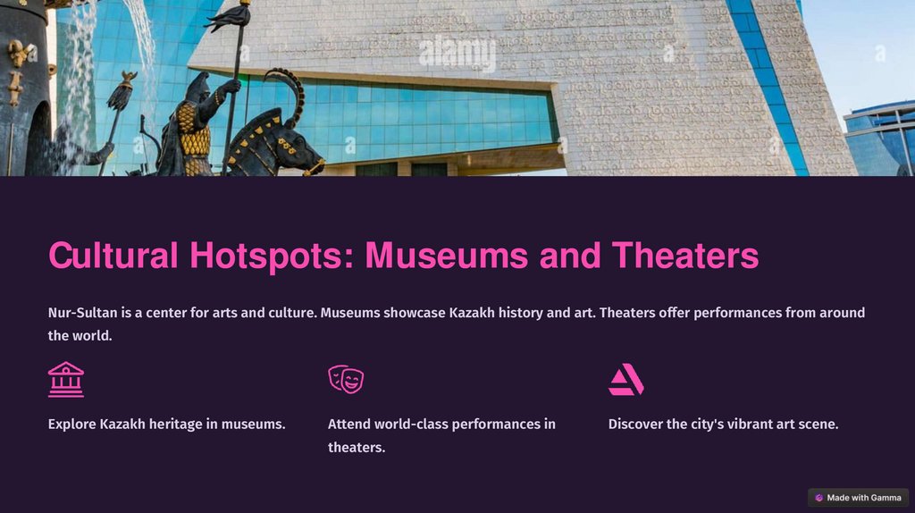 Cultural Hotspots: Museums and TheatersNur-Sultan is a center for arts and culture. Museums showcase Kazakh history and art. Theaters offer performances from around