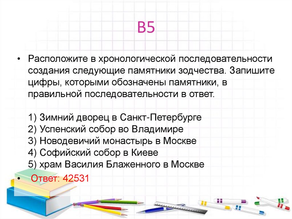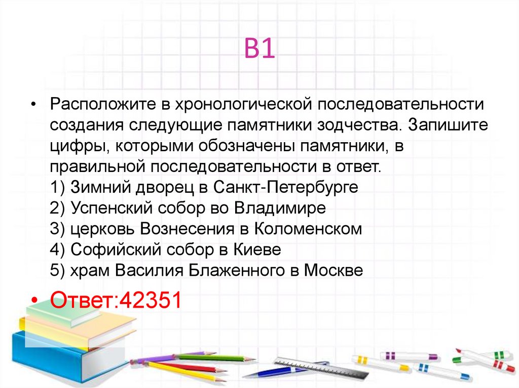 • Расположите в хронологической последовательностисоздания следующие памятники зодчества. Запишите