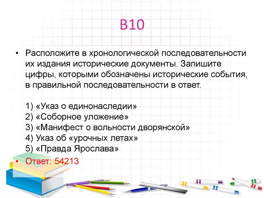 • Расположите в хронологической последовательностиих издания исторические документы. Запишите