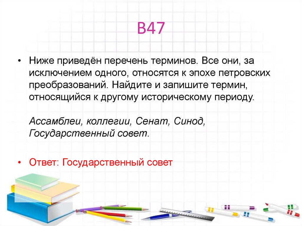 • Ниже приведён перечень терминов. Все они, заисключением одного, относятся к эпохе петровских