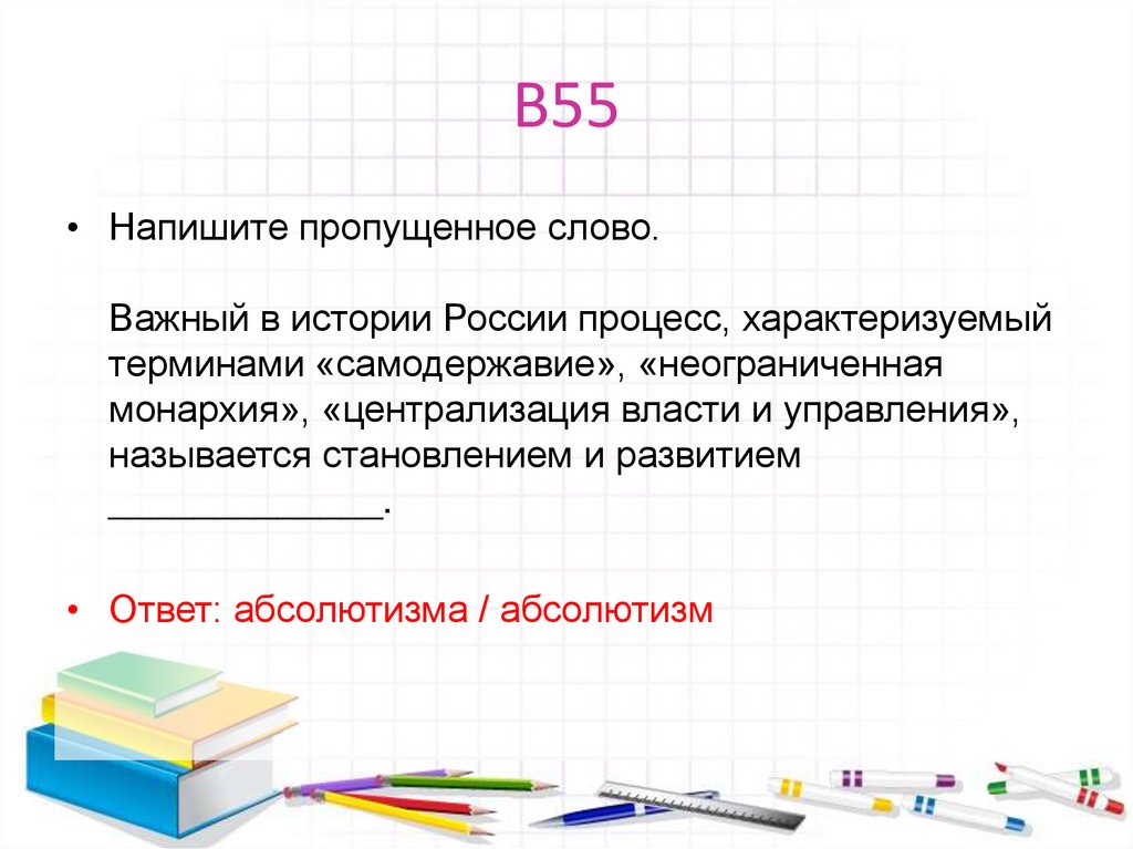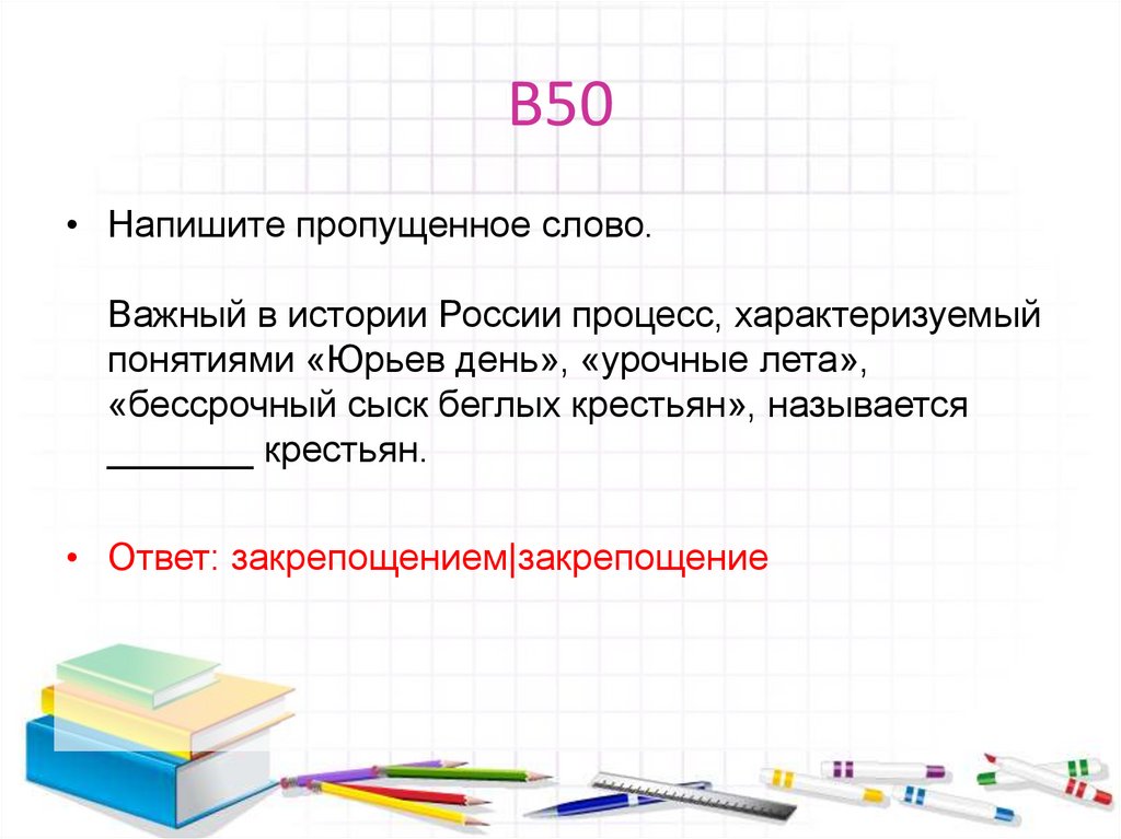 • Напишите пропущенное слово.Важный в истории России процесс, характеризуемый