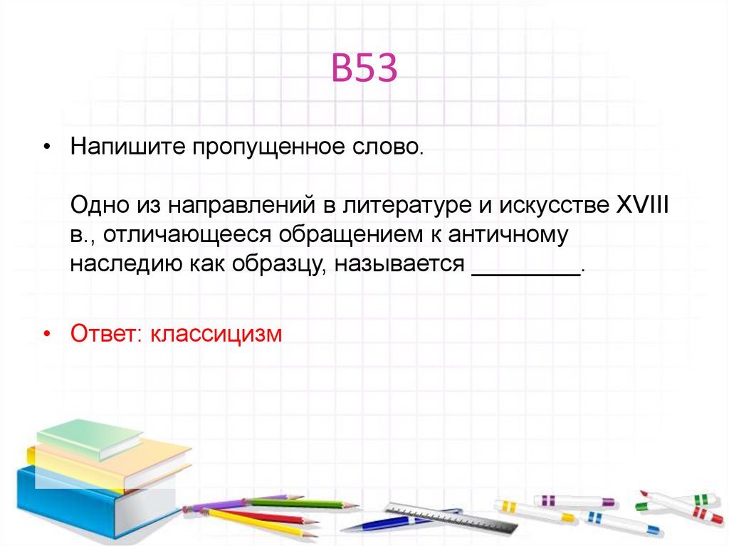 • Напишите пропущенное слово.Одно из направлений в литературе и искусстве XVIII