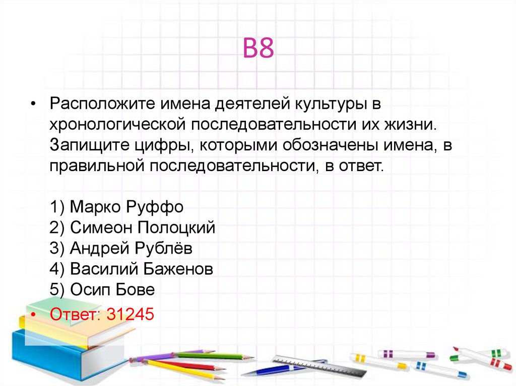 • Расположите имена деятелей культуры вхронологической последовательности их жизни.