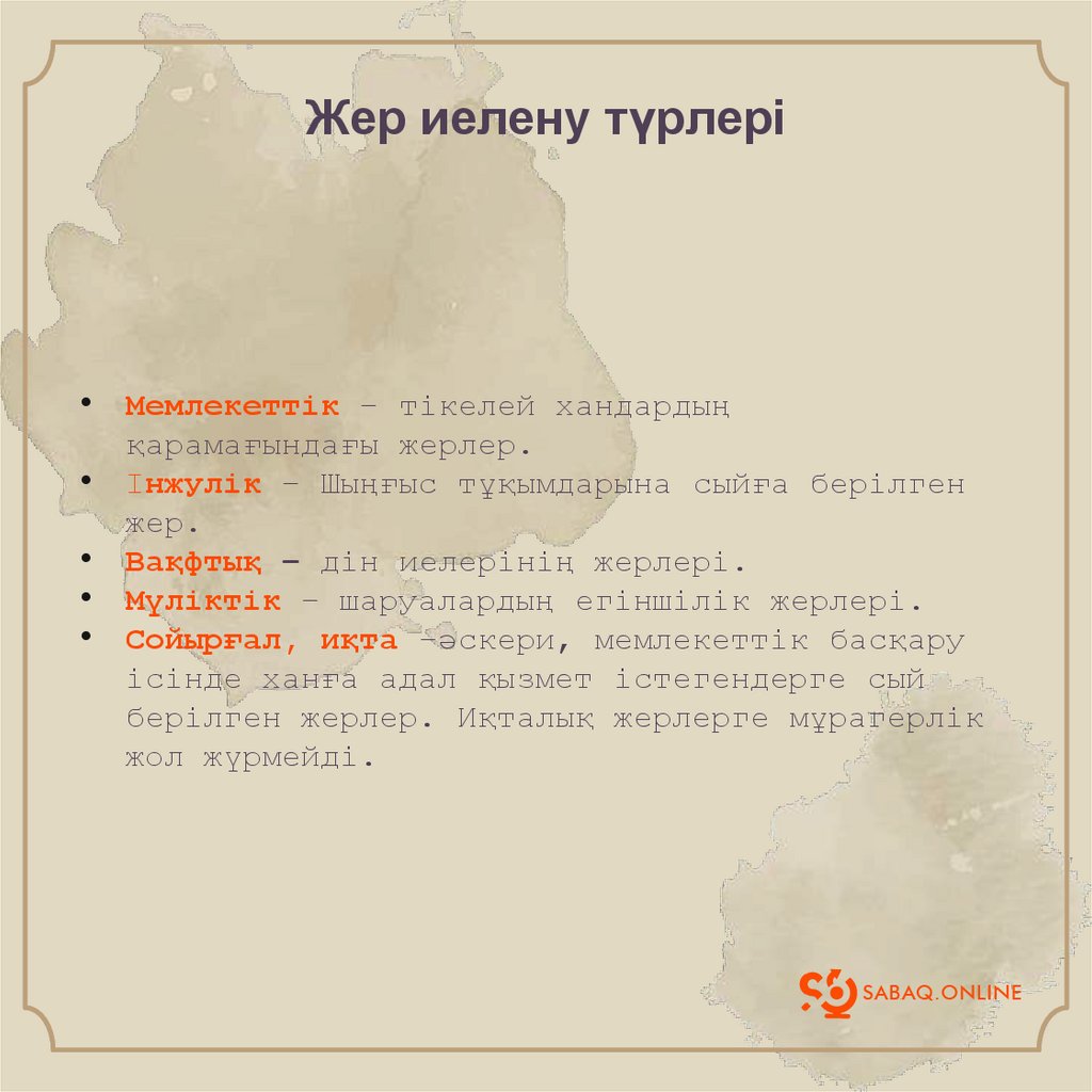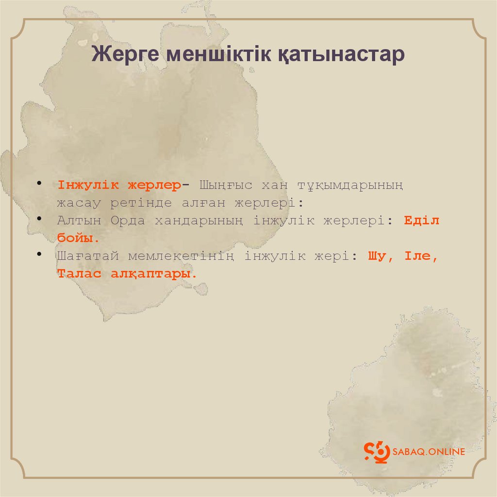 Жерге меншіктік қатынастар• Інжулік жерлер- Шыңғыс хан тұқымдарының