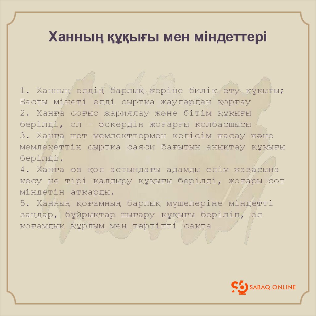 Ханның құқығы мен міндеттері1. Ханның елдің барлық жеріне билік ету құқығы;