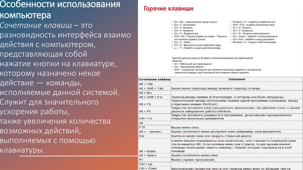 Особенности использованиякомпьютера