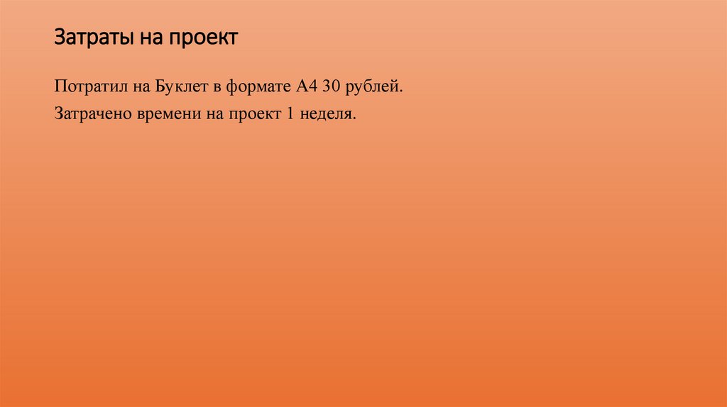 Затраты на проектПотратил на Буклет в формате А4 30 рублей.