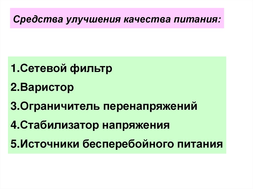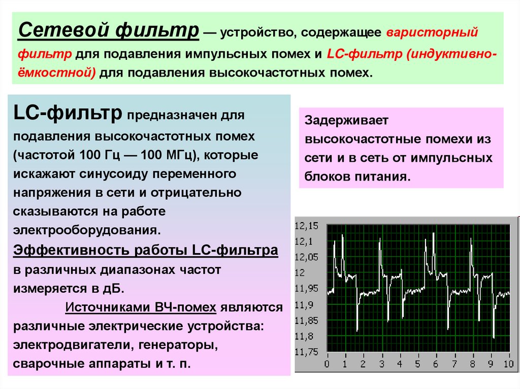 Сетевой фильтр — устройство, содержащее варисторныйфильтр для подавления импульсных помех и LC-фильтр (индуктивноёмкостной) для подавления высокочастотных помех.