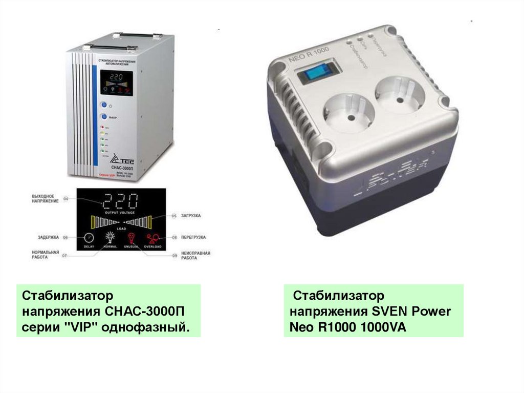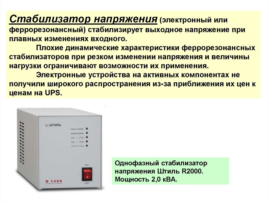 Стабилизатор напряжения (электронный илиферрорезонансный) стабилизирует выходное напряжение при
