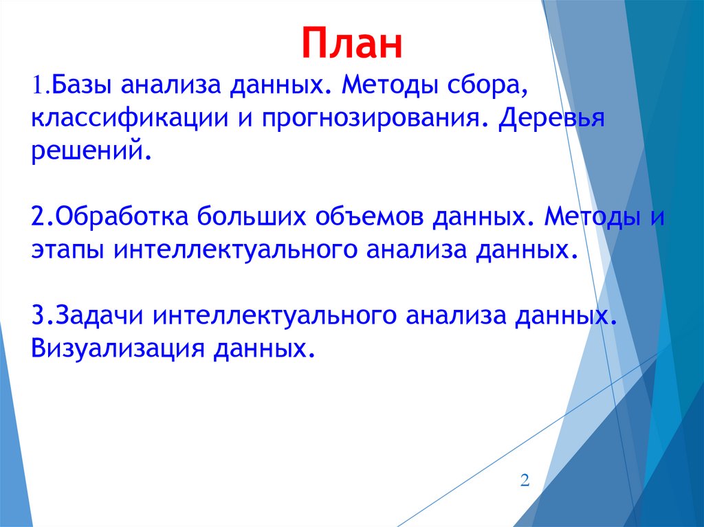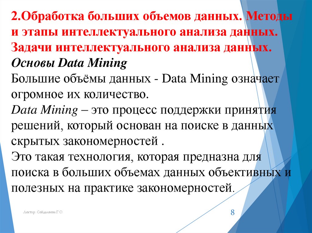 2.Обработка больших объемов данных. Методыи этапы интеллектуального анализа данных.