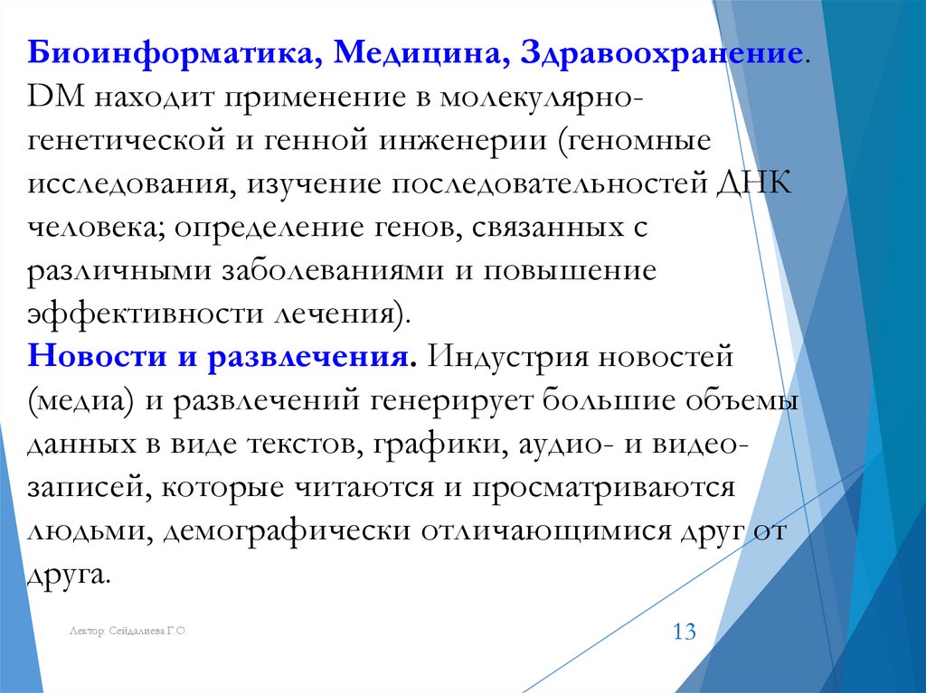 Биоинформатика, Медицина, Здравоохранение.DM находит применение в молекулярногенетической и генной инженерии (геномные
