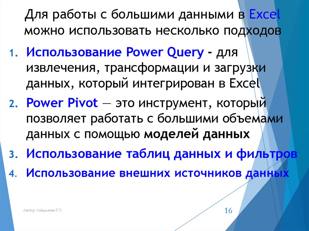 Для работы с большими данными в Excelможно использовать несколько подходов