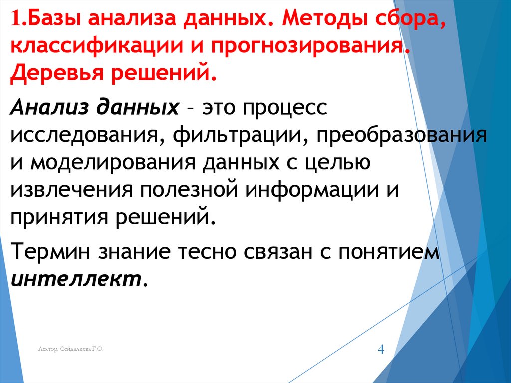 1.Базы анализа данных. Методы сбора,классификации и прогнозирования.