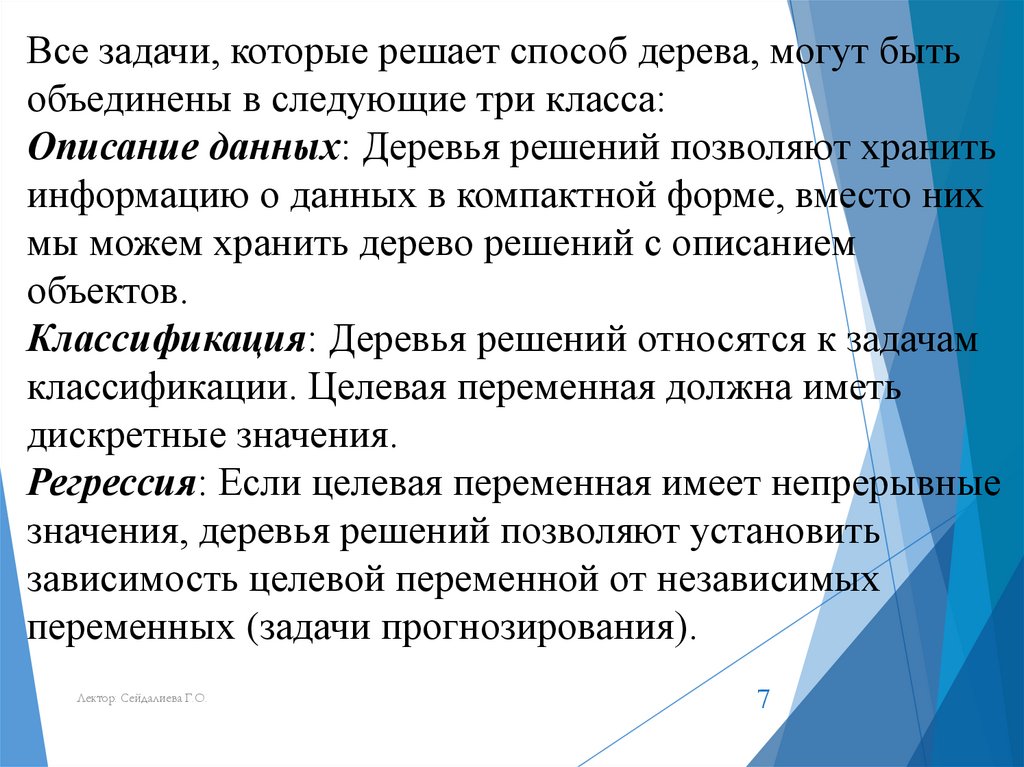 Все задачи, которые решает способ дерева, могут бытьобъединены в следующие три класса: