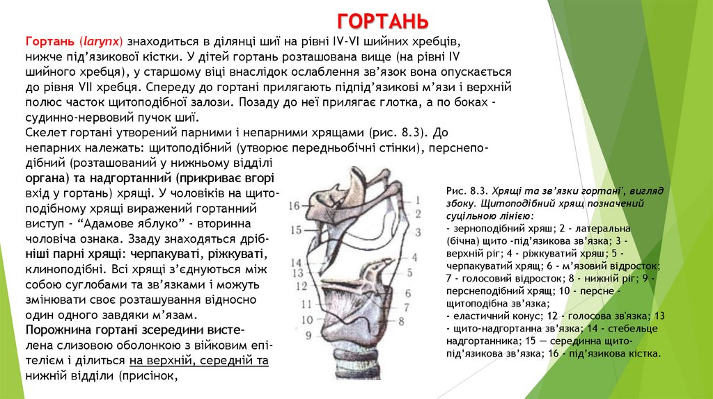 ГОРТАНЬГортань (larynx) знаходиться в ділянці шиї на рівні IV-VI шийних хребців,