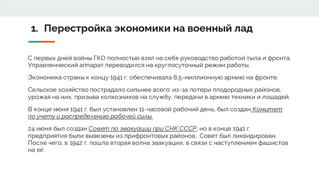 1. Перестройка экономики на военный ладС первых дней войны ГКО полностью взял на себя руководство работой тыла и фронта.
