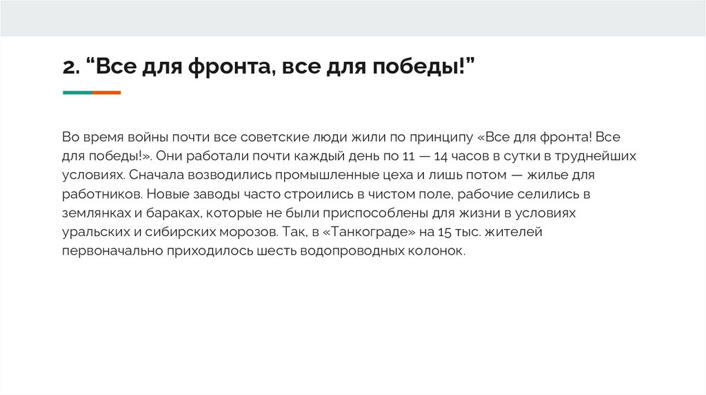 2. “Все для фронта, все для победы!”Во время войны почти все советские люди жили по принципу «Все для фронта! Все