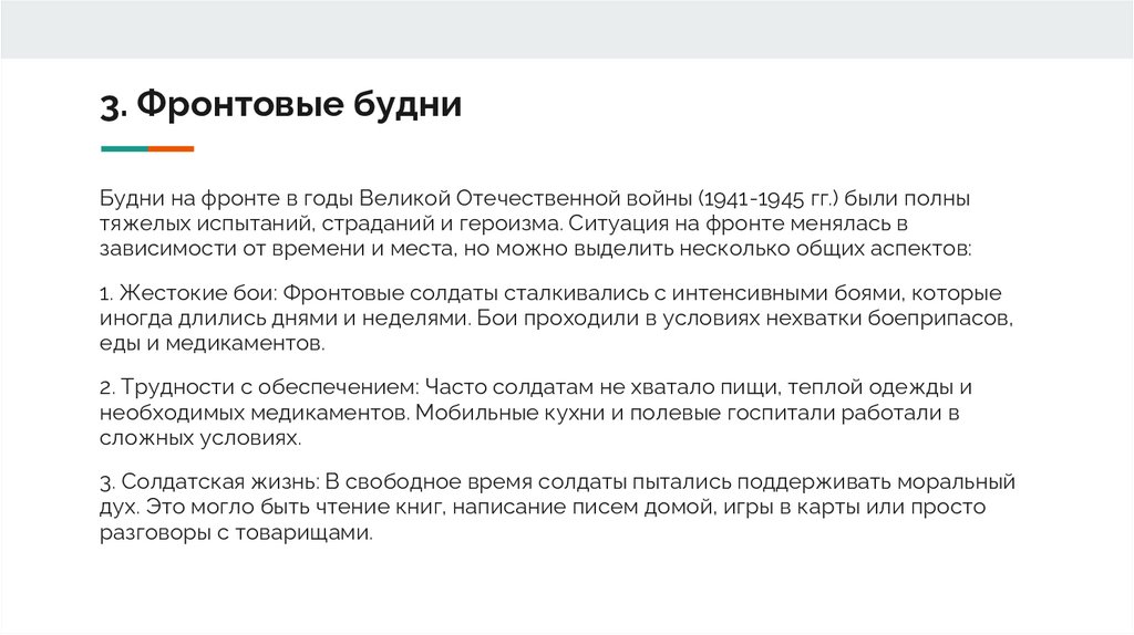 3. Фронтовые будниБудни на фронте в годы Великой Отечественной войны (1941-1945 гг.) были полны