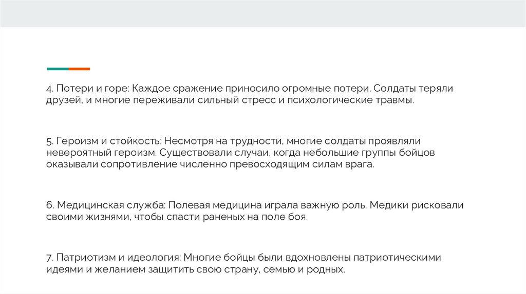 4. Потери и горе: Каждое сражение приносило огромные потери. Солдаты терялидрузей, и многие переживали сильный стресс и психологические травмы.